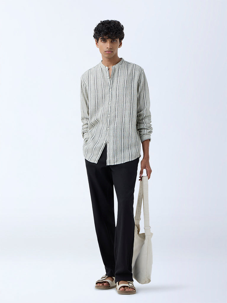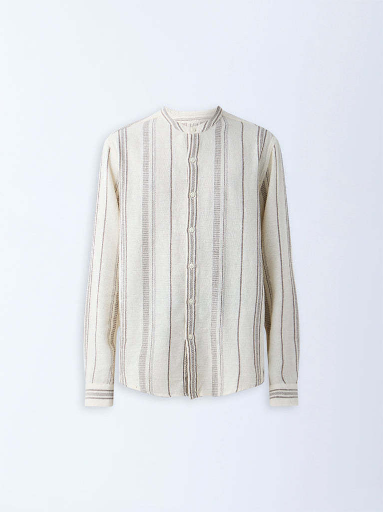 Exhibiting contrasting stripe prints, this off-white shirt from ETA is tailored from a lightweight fabric in a relaxed silhouette. Detailed with a band-neck collar, a button placket, and full sleeves, it brings an understated sophistication to smart-casual dressing.