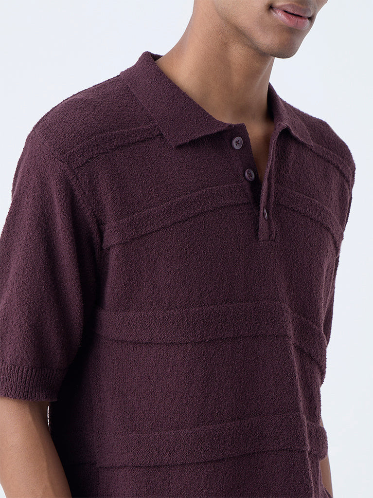 ETA Maroon Self-Striped Relaxed-Fit Cotton Polo T-Shirt