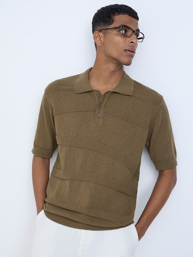 Ascot presents this dark brown polo t-shirt, defined by itself-striped texture over a premium-blend fabric. The relaxed frame, spread collar, zipper front and short sleeves combine comfort with structure. Designed for ease and polish, it complements both tailored and off-duty pairings effortlessly.