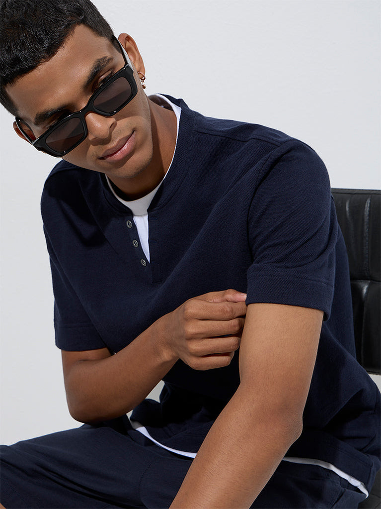 This navy t-shirt from ETA is constructed from a cotton-rich fabric in a relaxed silhouette for easy comfort. Styled with a round neck that merges into a V-cut with a three-button placket, it’s finished with half sleeves.