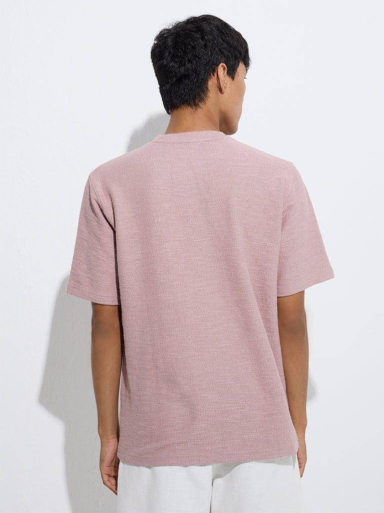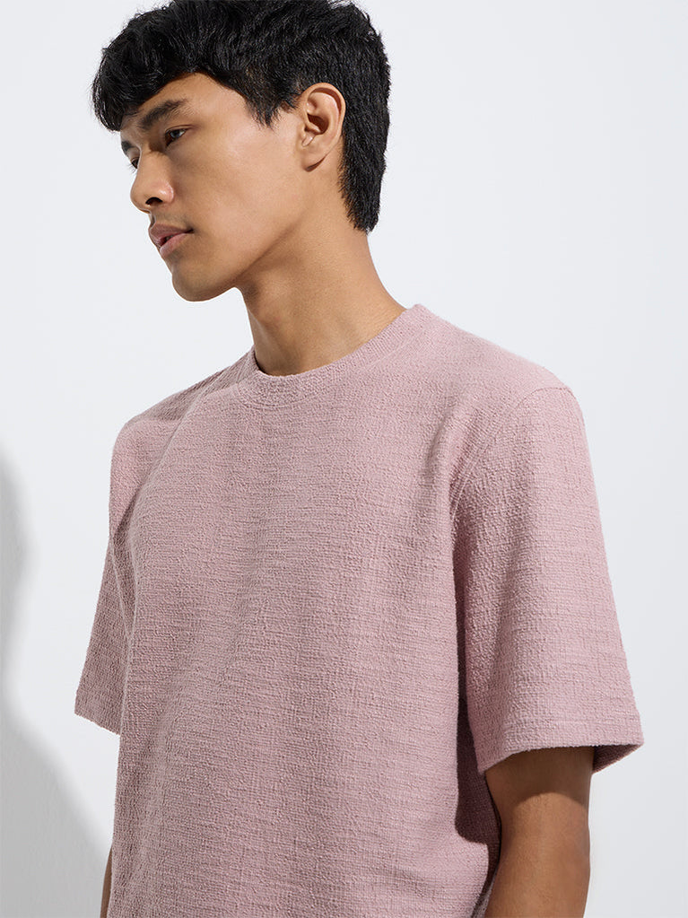 Crafted in a dusty pink hue, this textured t-shirt from ETA blends comfort with understated style. Made from a soft cotton-blend, it features a relaxed silhouette with a crew neck and half sleeves.