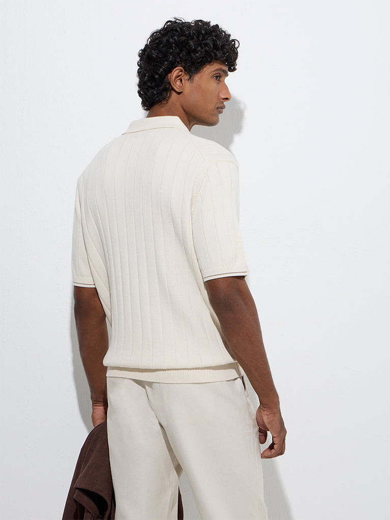 This off-white polo t-shirt from Ascot highlights self-stripes that lend depth to its refined look. Constructed from a stretch-infused cotton-blend material, it features a spread collar with a quarter-zip detail, half sleeves, and a ribbed hem that ensures a structured yet comfortable fit.