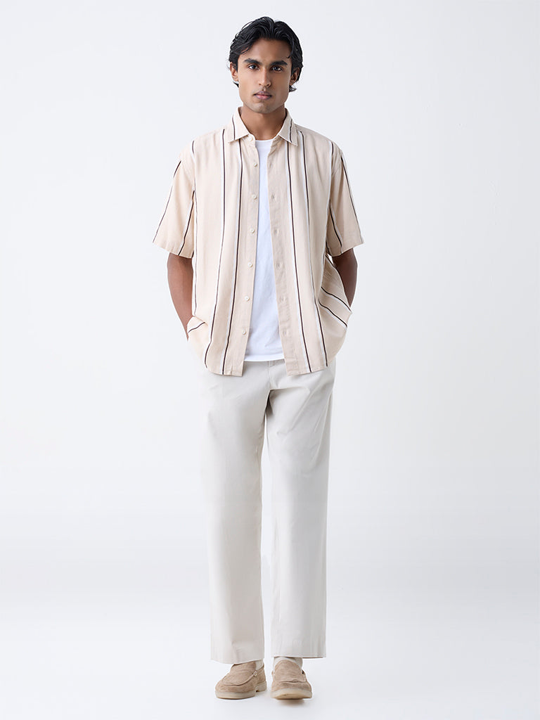 Ascot brings this beige shirt featuring striking stripe print on a relaxed frame. Woven from a soft, breathable fabric, it is framed with a semi-spread collar, a button-up front and short sleeves.