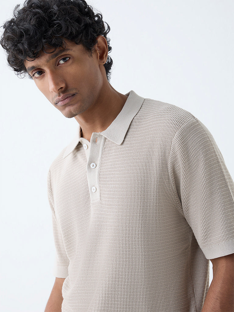 Ascot Beige Textured Relaxed-Fit Cotton-Blend Polo T-Shirt