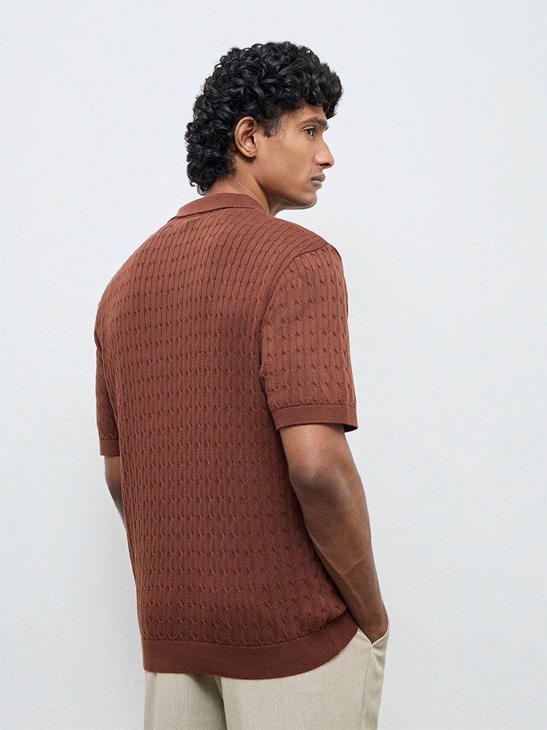 A simple pick for everyday polish, this rust polo t-shirt from Ascot is crafted from a cable-knit cotton fabric, delivering sumptuous comfort. Carved in a relaxed frame, it carries a classic collar, a short zipper placket and short sleeves. This minimal silhouette is designed for easy styling across casual and off-duty looks.