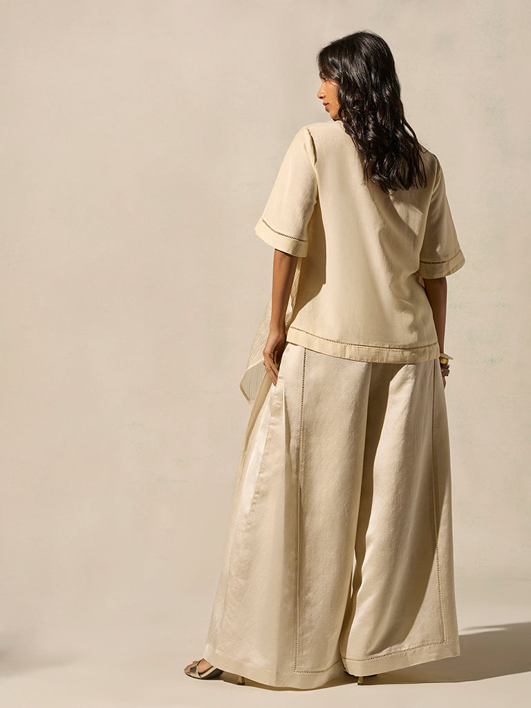 This ivory top slips effortlessly into your summer getaway wardrobe. Made from a breezy self-striped fabric, it features a sheer overlay that adds lightness and movement to the silhouette. The mandarin collar is detailed with a short button placket and is complemented by half sleeves finished with delicate lace inserts. An asymmetric hem lends a modern edge, making it an easy choice for pairing with wide-leg trousers on sun-soaked escapes.