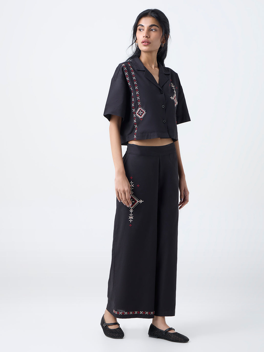Bring festive sparkle into your everyday wardrobe with this black shirt from Bombay Paisley, beautifully adorned with traditional-inspired embroidery that lends an artisanal glow. The notched lapel collar flows into a button-up front, while short sleeves keep the silhouette easy and relaxed. Crafted from a soft cotton-blend fabric, it is a versatile piece that transitions effortlessly from casual gatherings to celebratory evenings.