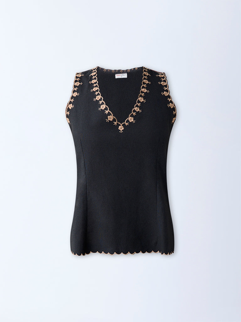 This black top from Bombay Paisley is detailed with intricate floral embroidery for a touch of elegance. Made from pure cotton, it features a V-neck and sleeveless cut, while the scalloped hem enhances its contemporary appeal.