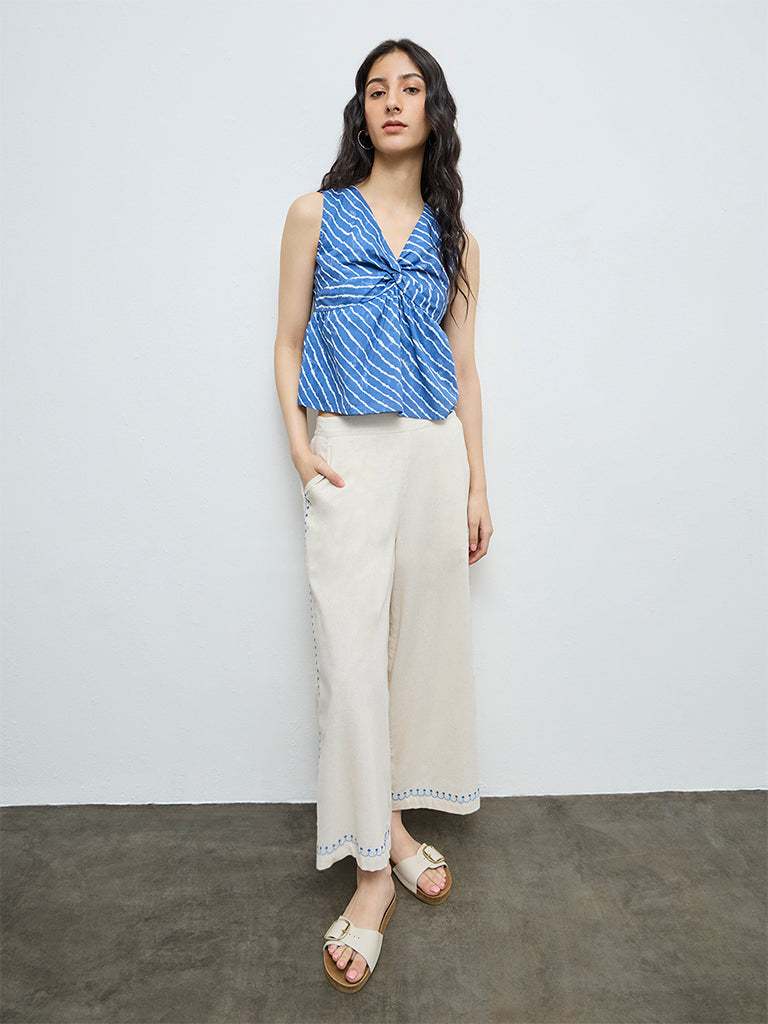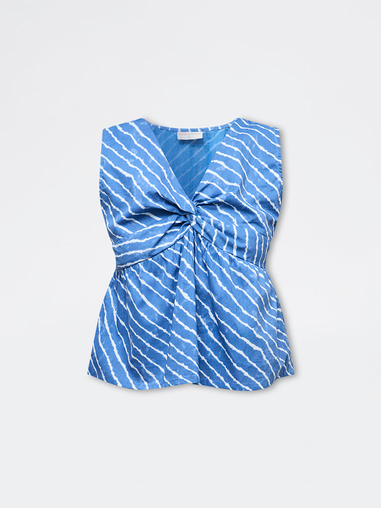 Bombay Paisley brings a relaxed update to everyday styling with this blue striped printed top. The peplum silhouette is styled with a V-neck highlighting a knot-detail and a sleeveless profile for a balanced and breezy silhouette. Crafted from breathable cotton fabric, this style remains comfortable for warm days and casual pairings.