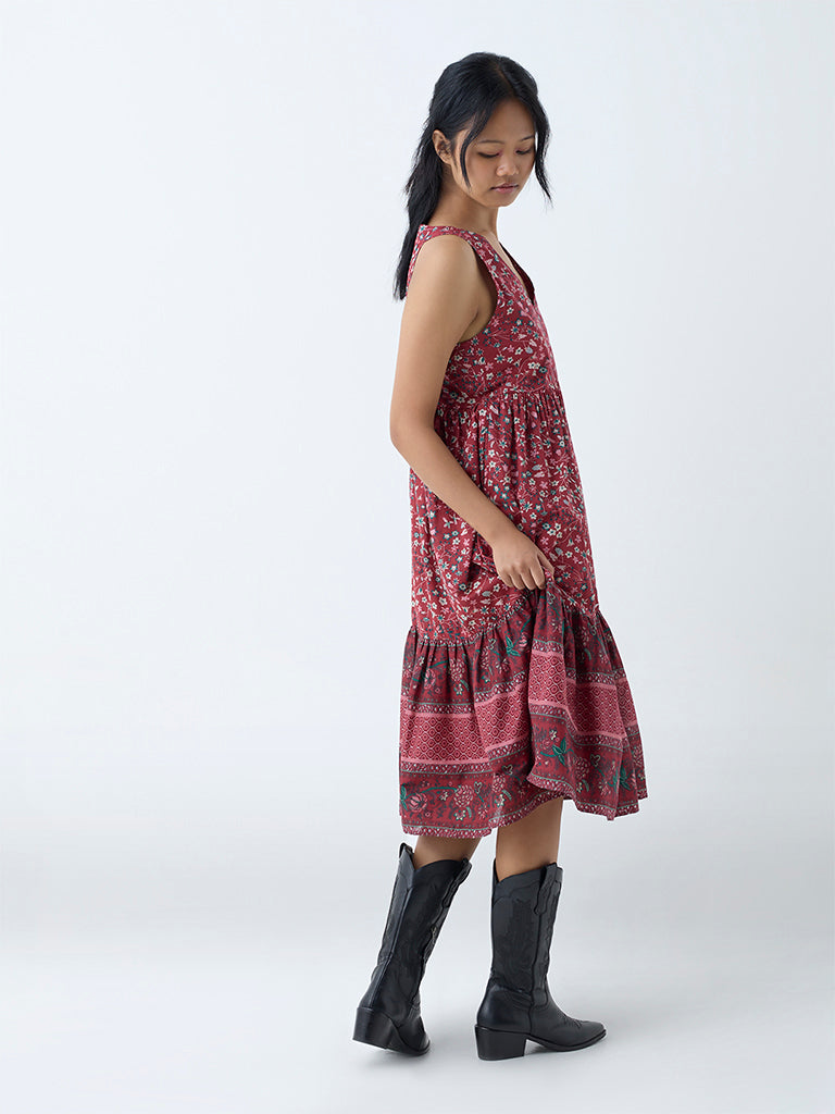 Bombay Paisley Maroon Floral Pattern Cotton Tiered Dress