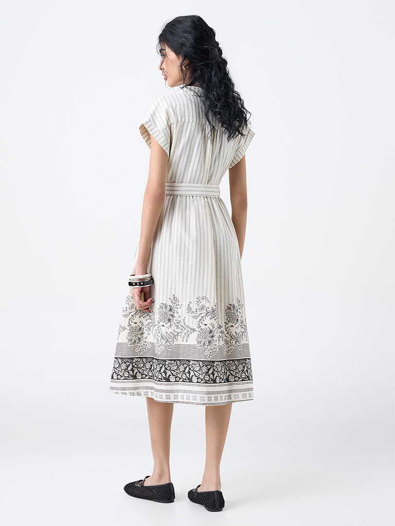 Refresh your summer wardrobe with this off-white dress by Bombay Paisley, designed with stripes that transition into floral prints along the hem for a playful visual shift. Crafted from a cotton-rich fabric in a fluid A-line shape, it features a V-neck, dolman sleeves and a neat button-up front that adds structure to the airy silhouette. A matching belt with a wooden buckle cinches the waist, while side pockets introduce everyday ease.