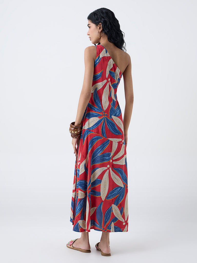 This red dress from Bombay Paisley is adorned with detailed foliage motifs. Spun from a breathable fabric, it offers a light, easy feel for warm days. The A-line silhouette is shaped with a one-shoulder neckline that adds a graceful touch.