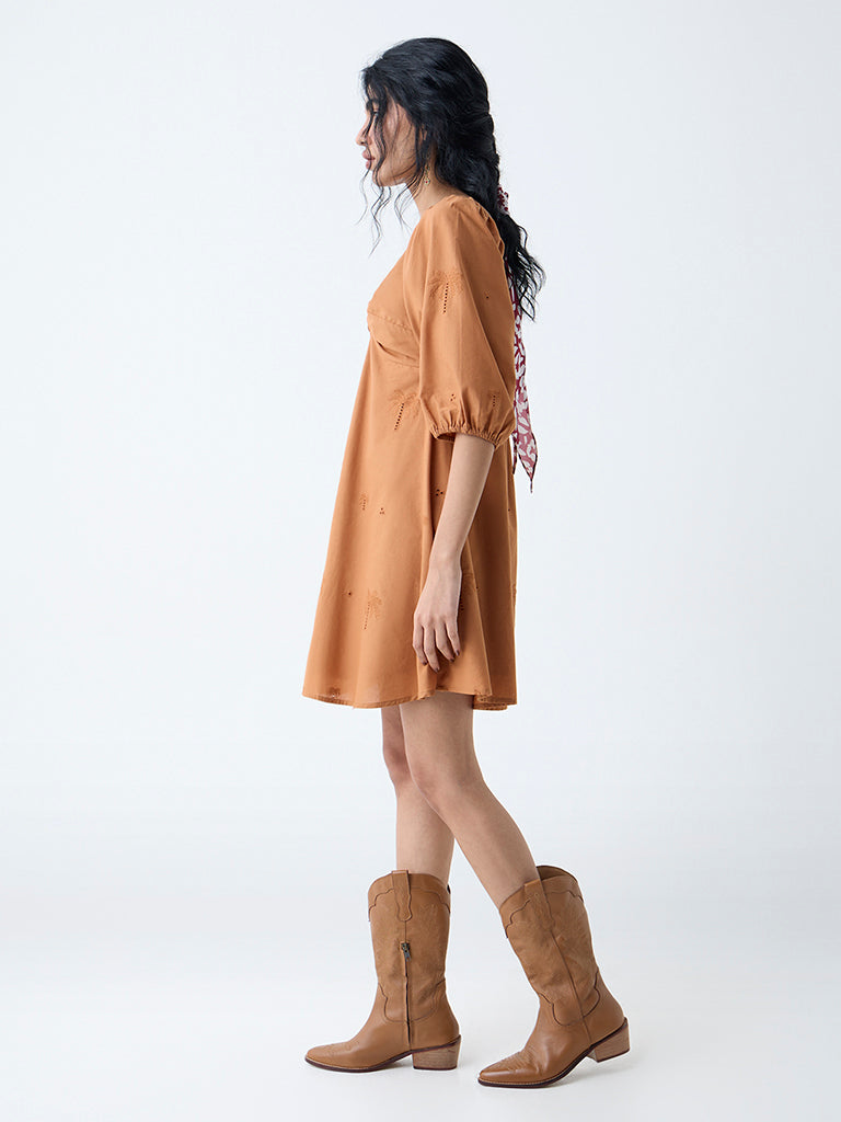 Bombay Paisley Tan Embroidered Cotton A-Line Dress