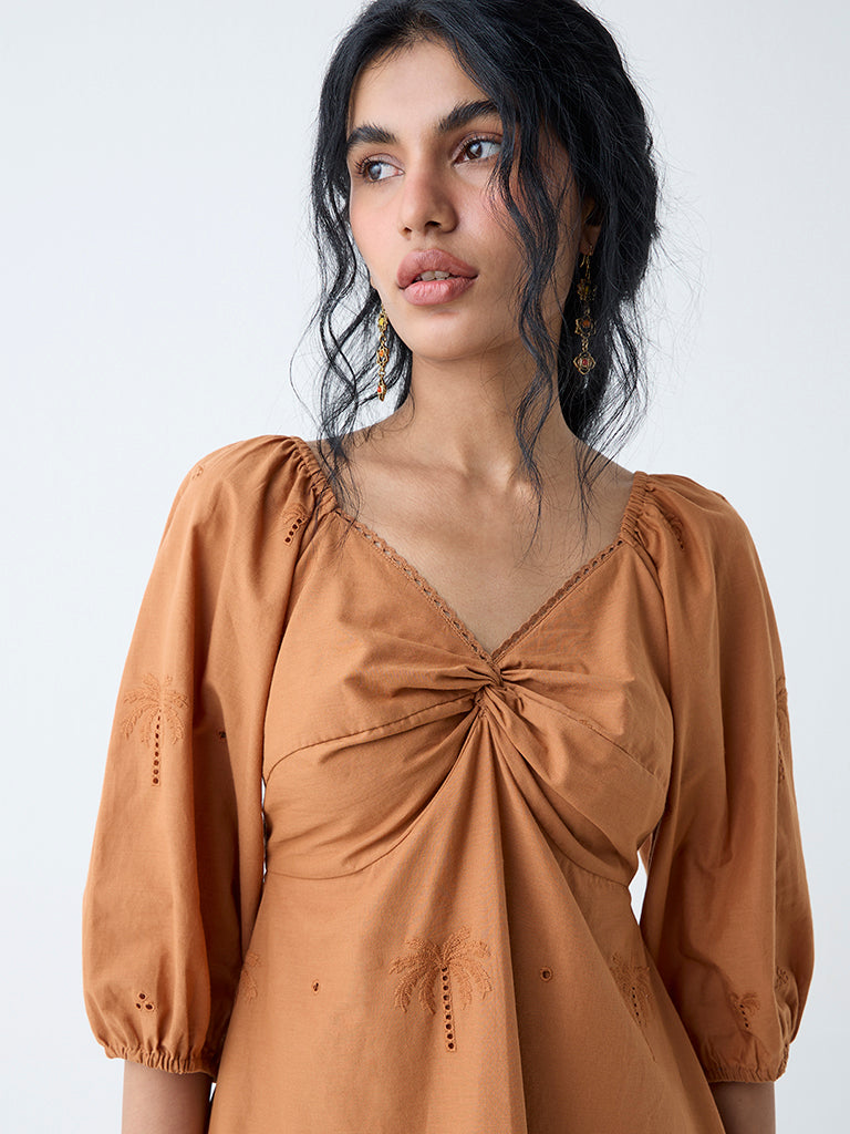 Lend a splash of tropical flair to your wardrobe with this tan dress from Bombay Paisley. Detailed with intricate embroidery, it’s crafted in pure cotton and styled with a Sweetheart neck and ruched bodice for a flattering shape. A smocked back ensures comfort, while blouson sleeves give it a chic finish.