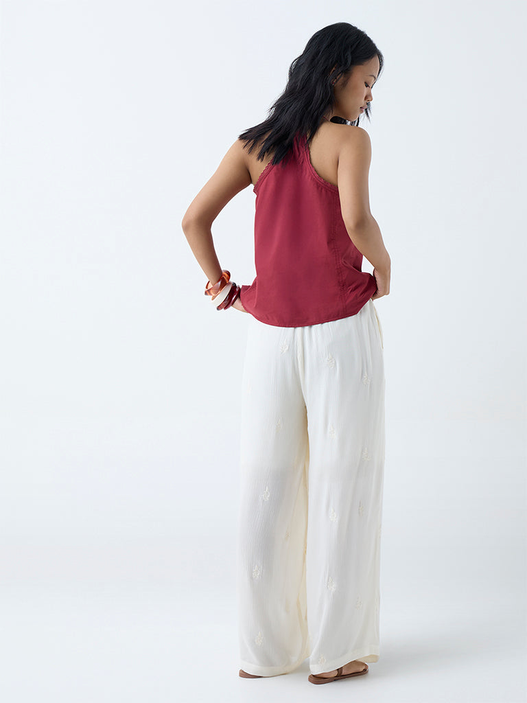 These white pants from Bombay Paisley are made from a crinkle-textured fabric that brings subtle dimension to your off-duty looks. Embroidered detailing adds a touch of character, while the elasticated waistband with adjustable drawstrings ensures a personalised fit. Finished with side pockets for added function, they’re an easygoing essential made for relaxed days.