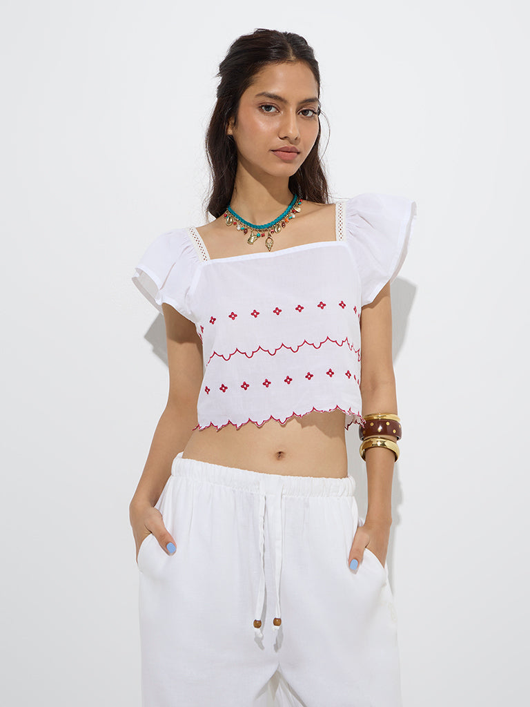 Embrace bohemian elegance with this white top from Bombay Paisley. Beautifully highlighting charming floral motifs, this pure-cotton separate is fitted with a square neck accented with intricate crochet detailing and butterfly sleeves for a touch of romantic flair.