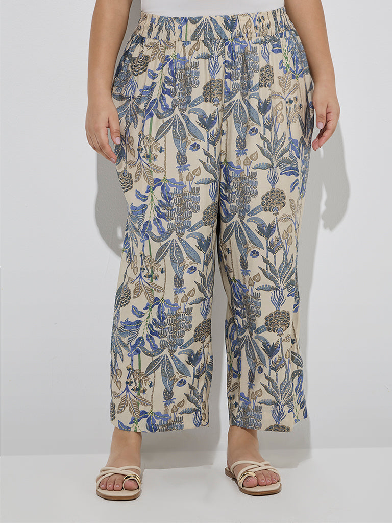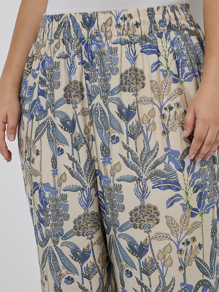 These beige ethnic pants from Diza showcase vibrant botanical prints on a super-soft fabric base. Designed with an elasticated waistband and adjustable drawstrings, they offer a comfortable fit.