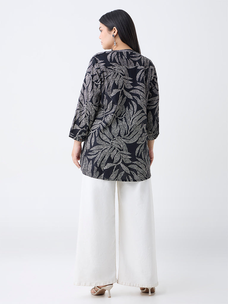 A thoughtful pick for everyday festive ease, this black tunic from Diza is crafted from breathable fabric that feels soft through the day. Bandhani-style leaf motifs add gentle festive charm, while the mandarin neck with a quarter button placket and three-quarter sleeves keep it effortless for daily wear.