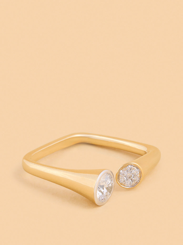 Enjoy the allure of this juxtaposed lab diamond ring with a solitaire & diamond cluster. Crafted in gold vermeil, it offers a unique design that beautifully showcases the charm and brilliance of the diamond.