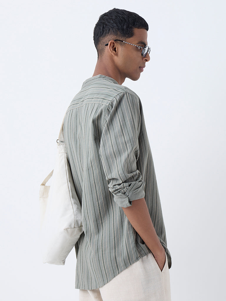ETA introduces this sage shirt showcasing stripe patterns on a cotton-rich fabric base. Designed in a relaxed-fit silhouette, it features a mandarin collar, a button-up front and full sleeves. A polished essential that brings ease and refinement to dressed-up casual looks.