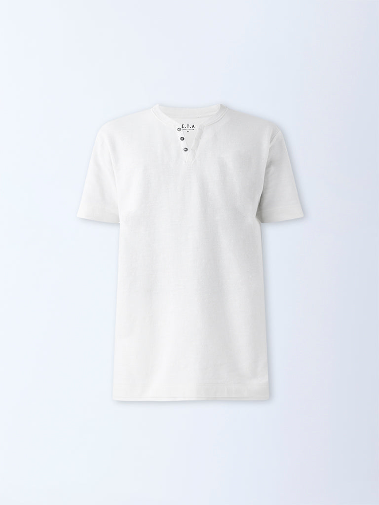 A fresh take on a wardrobe classic, this white tee from ETA blends simplicity with subtle detail. Spun from pure cotton, it features a round neck with a V-cut illusion and three-button placket that adds quiet character. Finished with short sleeves, it delivers an easy-going look for everyday wear.