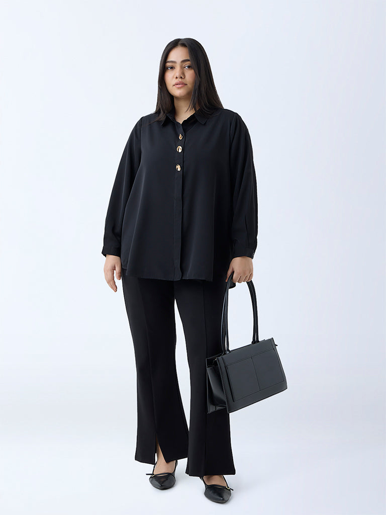 This black blouse from Gia leans into quiet sophistication with its minimal silhouette and luxurious hand feel. Crafted from a sumptuous fabric, it’s detailed with a collar and a gold-toned button placket that adds just the right touch of shine. Finished with full sleeves, it’s the kind of piece that speaks volumes without raising its voice.