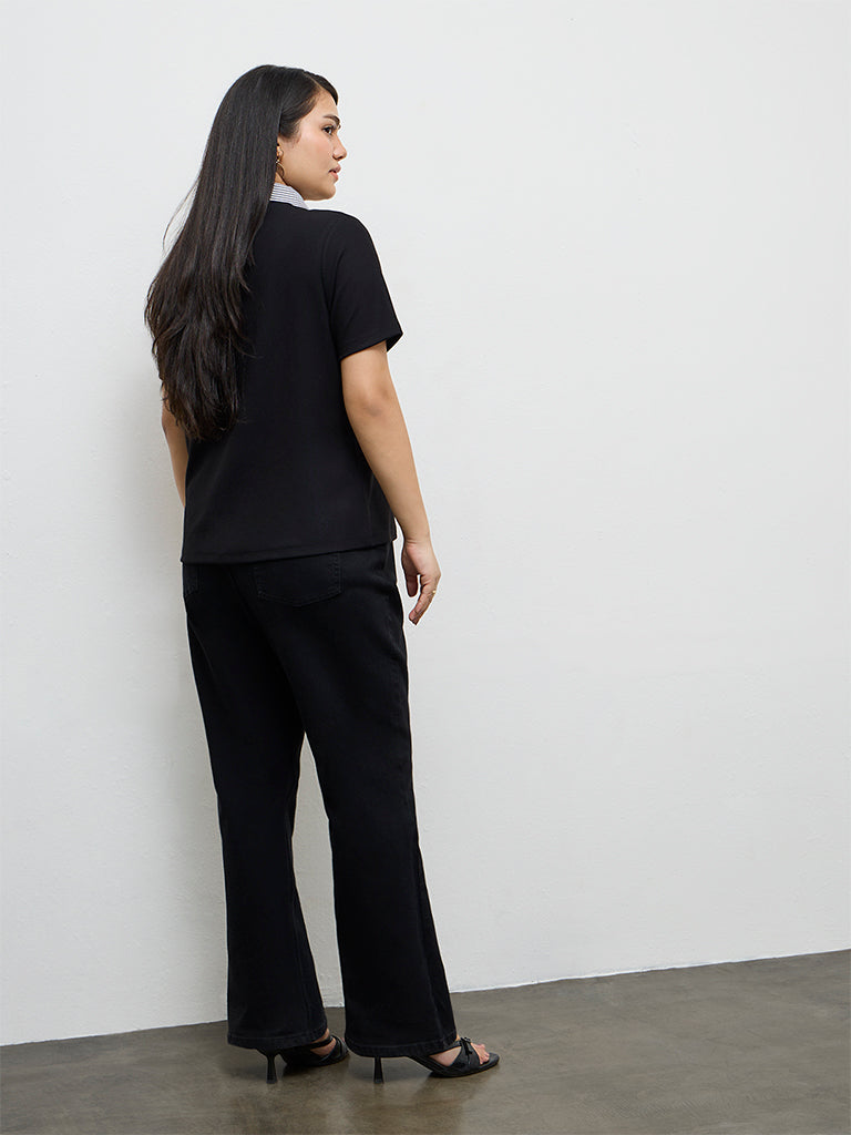 Gia presents this black top designed with a layered look that adds a smart, contemporary touch to the silhouette. Crafted from a breathable fabric, it offers comfort through the day. The design features a collared neckline with a striped shirt-style collar detail and short sleeves, creating a polished profile suited for both work and casual settings.