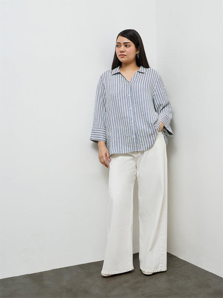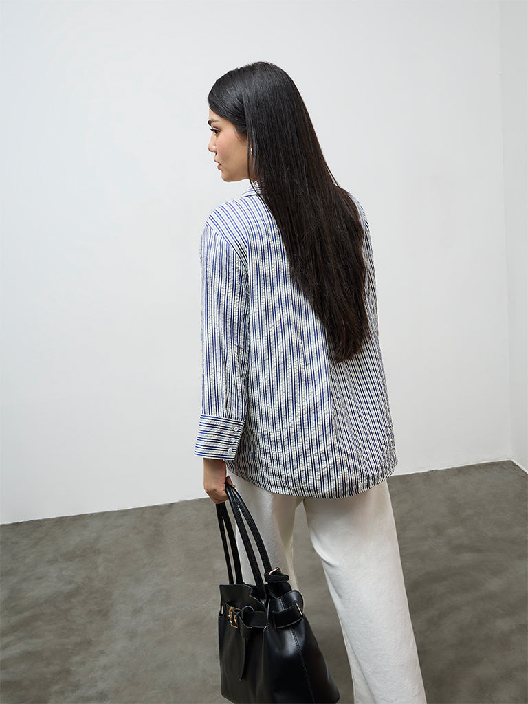 A polished appeal defines this navy striped shirt from Gia. Designed in a relaxed silhouette, it features a notch collar, a button-up front and full sleeves that lend a clean finish. Crafted from a premium-blend fabric, it offers lasting comfort, making it well suited for long, busy days.