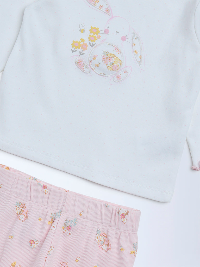 HOP Baby presents this pink set crafted from pure cotton for soft, breathable comfort. The t-shirt features a sweet rabbit and floral motif, finished with a round neckline and full sleeves. Paired with pants designed with an elasticated waistband, this set ensures a snug yet flexible fit for all-day wear.