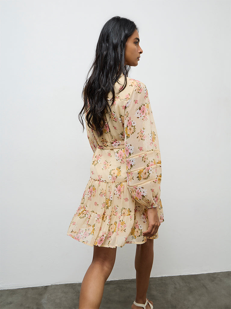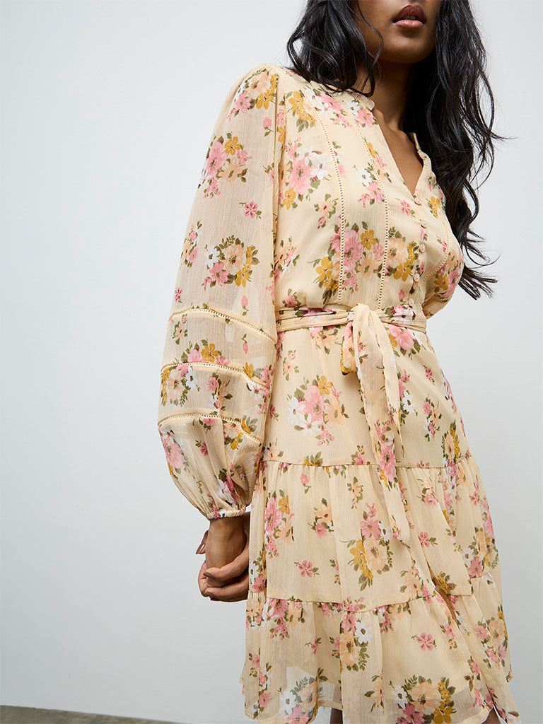 LOV introduces this yellow dress, made of a lightweight material that gives an ultra-soft feel. It is designed in a tired silhouette, carrying a notch-neck, peasant sleeves and a matching belt that cinches waist. The ruffled tiers and floral prints lend the piece a soft, romantic character.