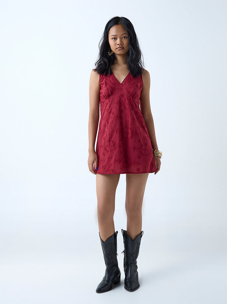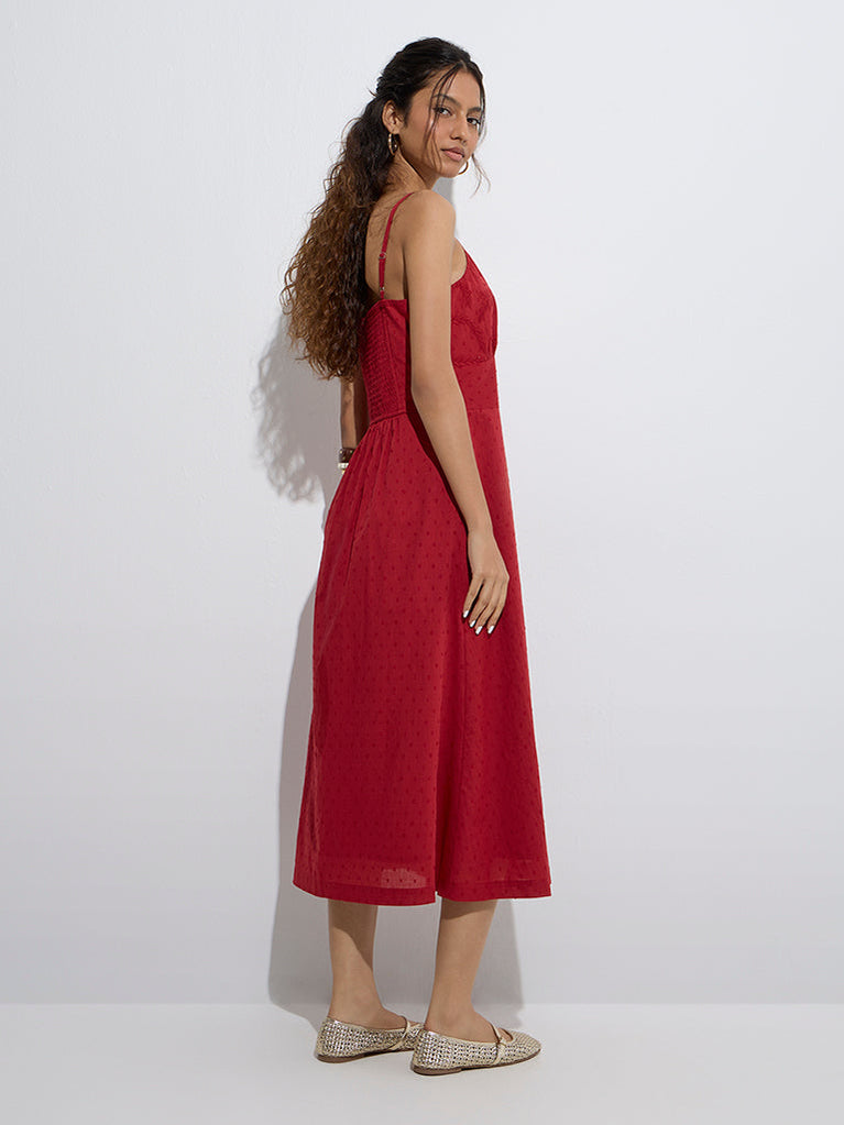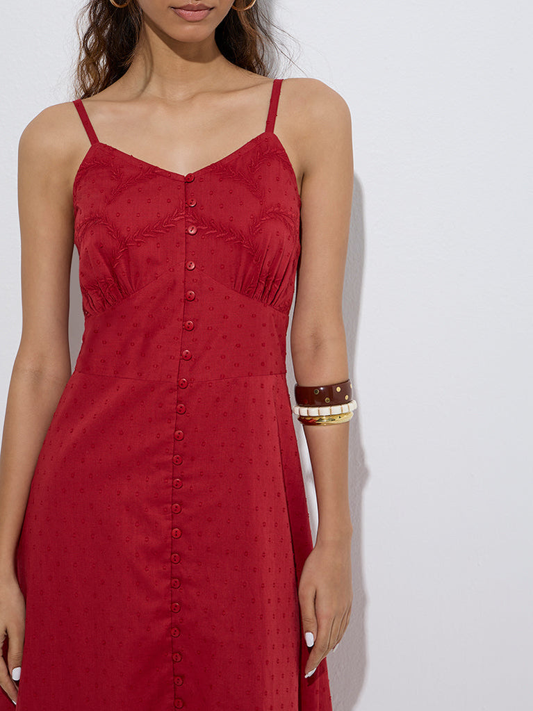 Sculpted in an A-line silhouette, this red dress from Bombay Paisley is fashioned with Swiss-dot embroidery throughout. Its pure cotton build ensures enhanced comfort, while the V-neck and adjustable straps make it a breezy choice for sunlit days and relaxed outings.