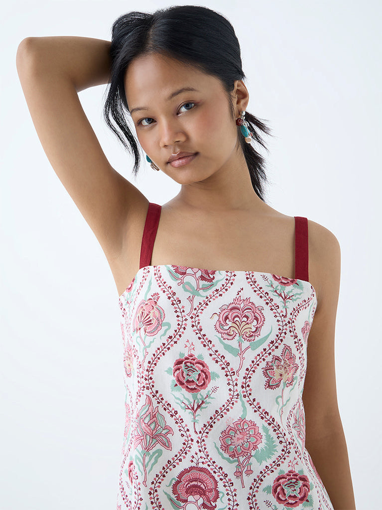 Bombay Paisley presents this red dress adorned with floral prints across the silhouette. Cut from breathable pure cotton, it features a square neck, sleeveless design and a smocked back that ensures comfort. A breezy piece that makes a charming choice for sunny-day outings.