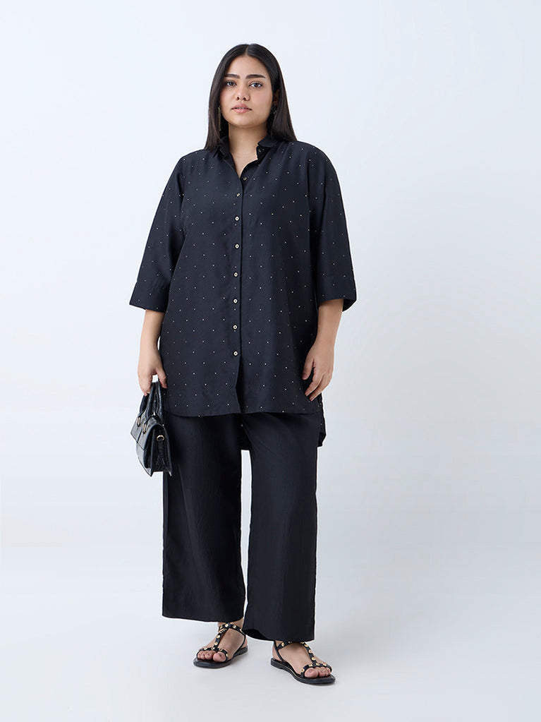 Diza introduces this black tunic, detailed with shimmering badla prints that add a subtle festive sheen. Crafted from a sumptuous fabric, it features a structured collar, a button-up front and three-quarter sleeves for a polished look.