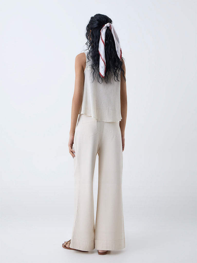 Enhance your style quotient with this off-white top from Bombay Paisley. Cross-stitch embroidery on a crinkle-textured layer brings subtle artistry, while a V-neck and sleeveless cut keep it breezy and modern. Constructed from a cotton-rich fabric, it offers superior comfort throughout the day.