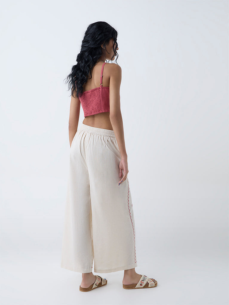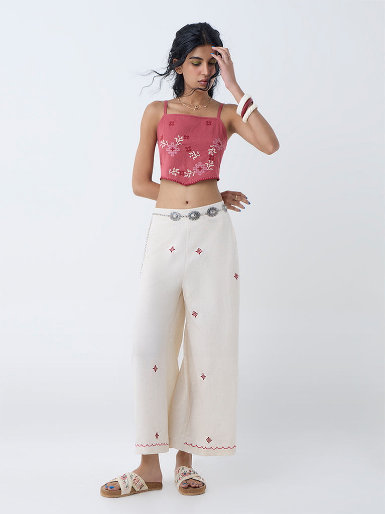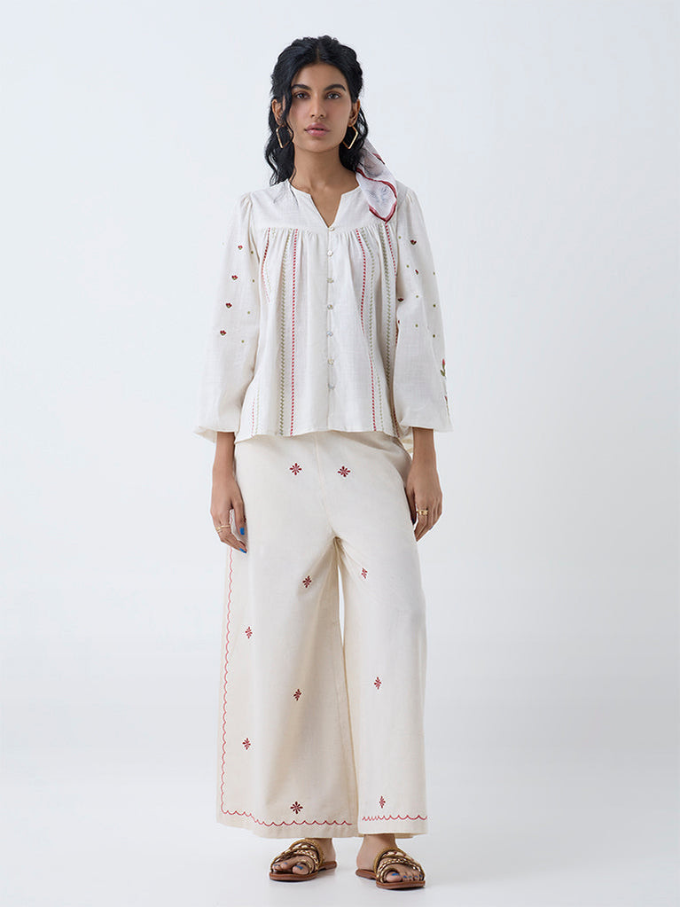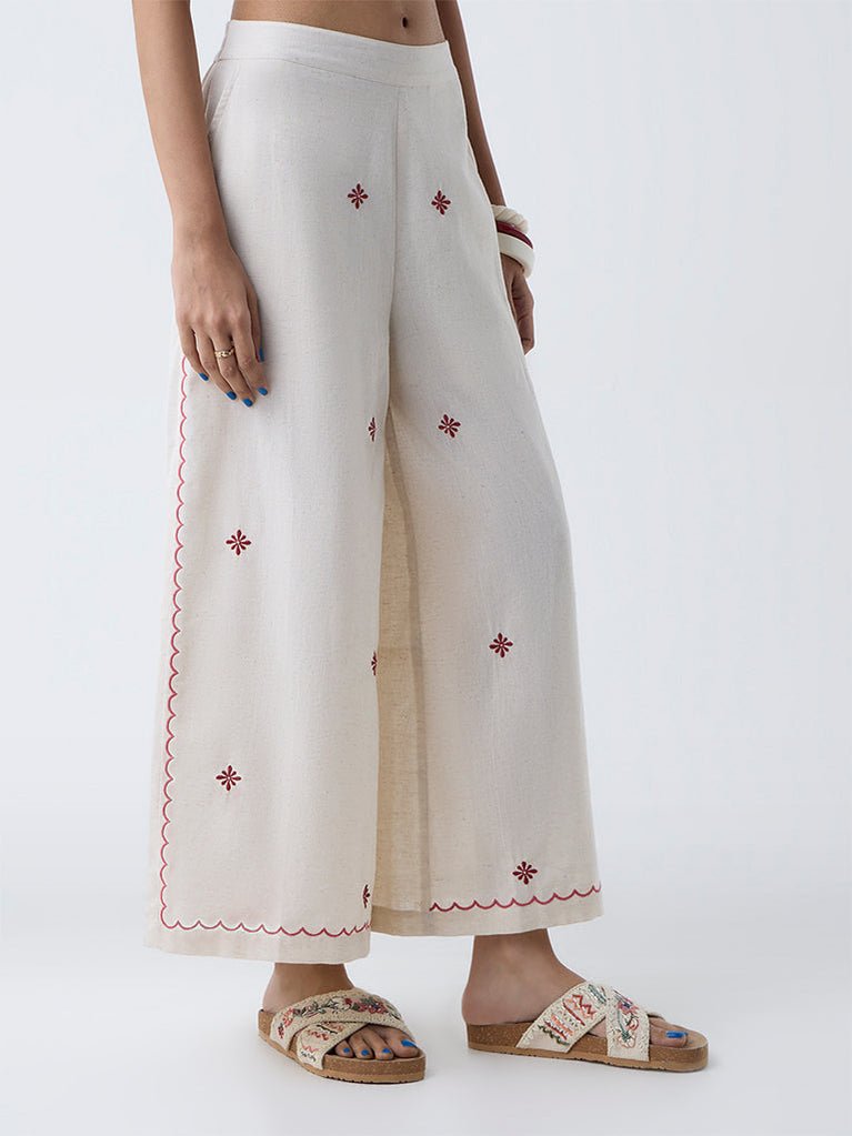 Infuse your day with breezy sophistication in these wide-leg off-white pants by Bombay Paisley. Crafted from pure cotton, they feature belt loops, a button closure, and a zipper placket for a structured yet relaxed fit. The front pockets highlight tonal floral embroidery, adding a subtle touch of artistry, while the braided belt completes the look.