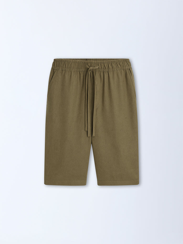 ETA Olive Solid Relaxed-Fit Mid-Rise Cotton-Blend Shorts