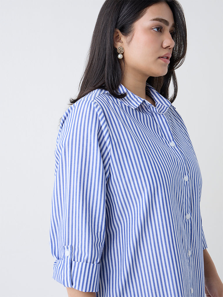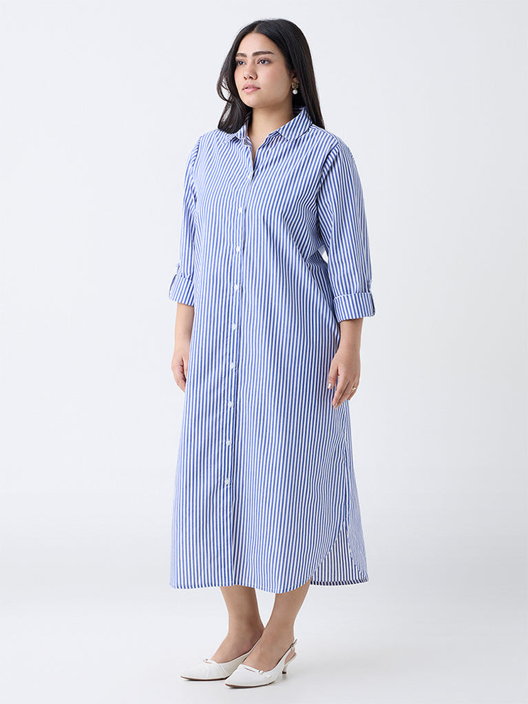 A true warm-weather staple, this blue striped shirtdress from Gia blends comfort with understated sophistication. Crafted from pure cotton, it features a crisp collar, button-down front and full sleeves that lend a refined silhouette. Handy side pockets add everyday practicality, making it a go-to for brunch plans, travel days or easy summer strolls.
