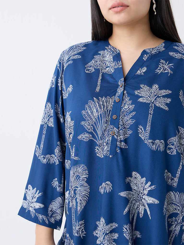 Infused with earthy elegance, Diza indigo tunic is detailed with foliage motifs that offer subtle festive character. Woven from a lightweight fabric, it features a notched neckline leading into a quarter button placket and full sleeves.