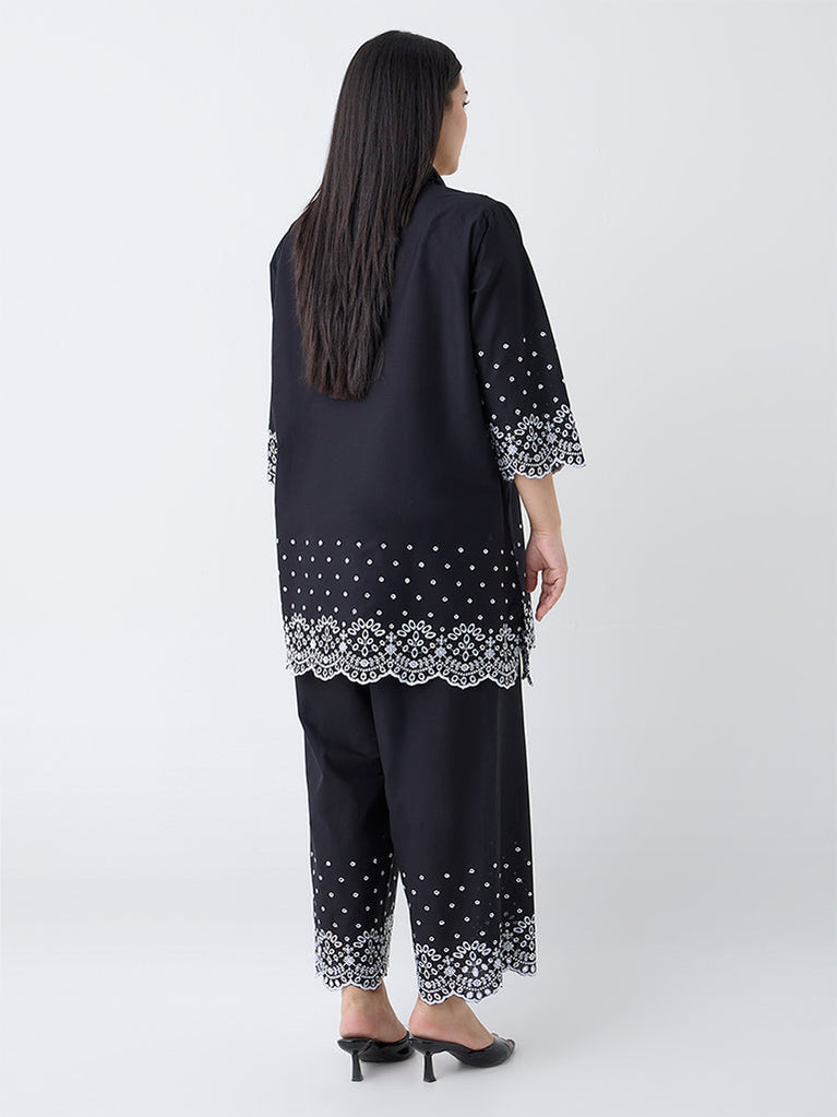 Diza black tunic showcases intricate schiffli embroidery for a distinctly festive appeal. Crafted from a cotton-rich fabric that offers structure with softness, it features a classic collar, button placket, and 3/4th sleeves finished with scalloped edges for a beautifully feminine finish.