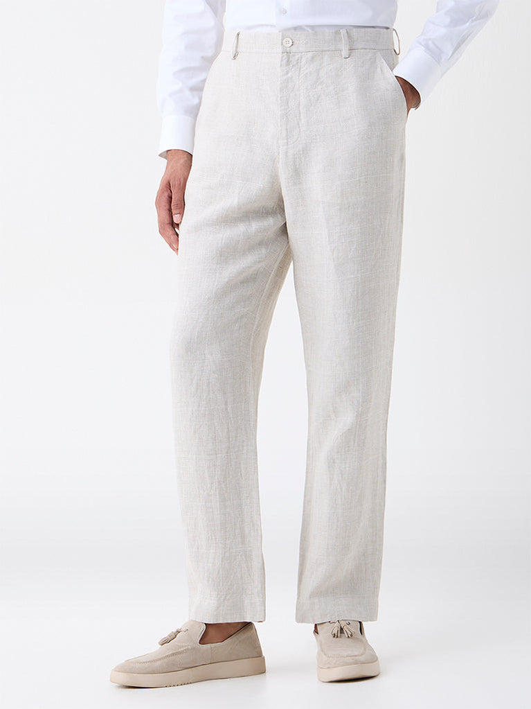 Ascot Beige Checked Relaxed-Fit Mid-Rise Linen Trousers