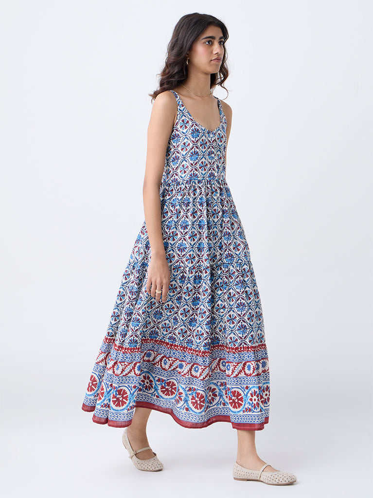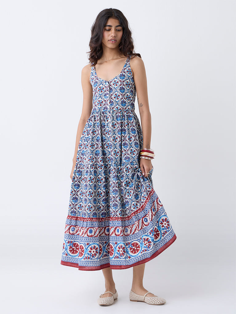 Bombay Paisley Blue Floral Cotton Tiered Dress