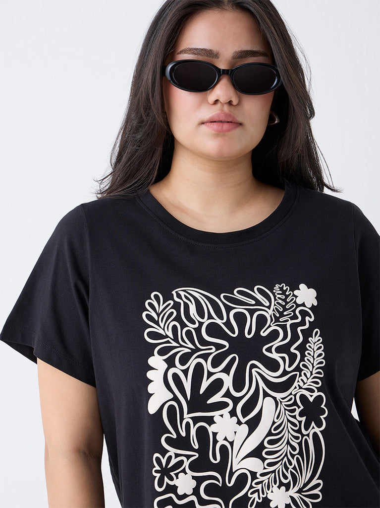 Black tee by Gia accented with foliage motifs that bring a refined, nature-inspired charm. Crafted from pure cotton, it feels soft against the skin while offering a relaxed, curve-friendly fit. Finished with a classic round neck and short sleeves, it is an everyday piece that balances comfort and quiet style with ease.