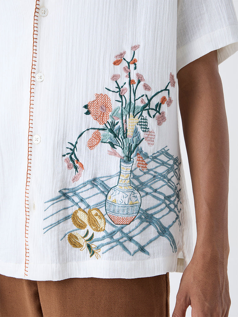 ETA White Floral Embroidered Relaxed-Fit Cotton Shirt