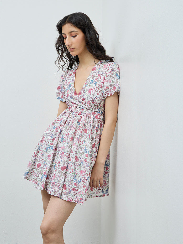 Celebrate graceful movement with this pink a-line dress by Bombay Paisley, designed to flatter and flow. Made from a cotton-rich fabric with an all-over floral design, it is finished with a V-neckline and puff sleeves, while the smocked back offers all-day comfort with a feminine fit.