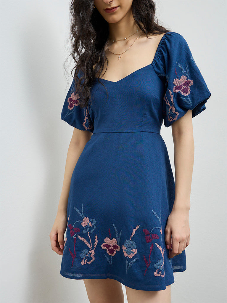 Bombay Paisley Blue Floral Embroidered A-Line Cotton Dress