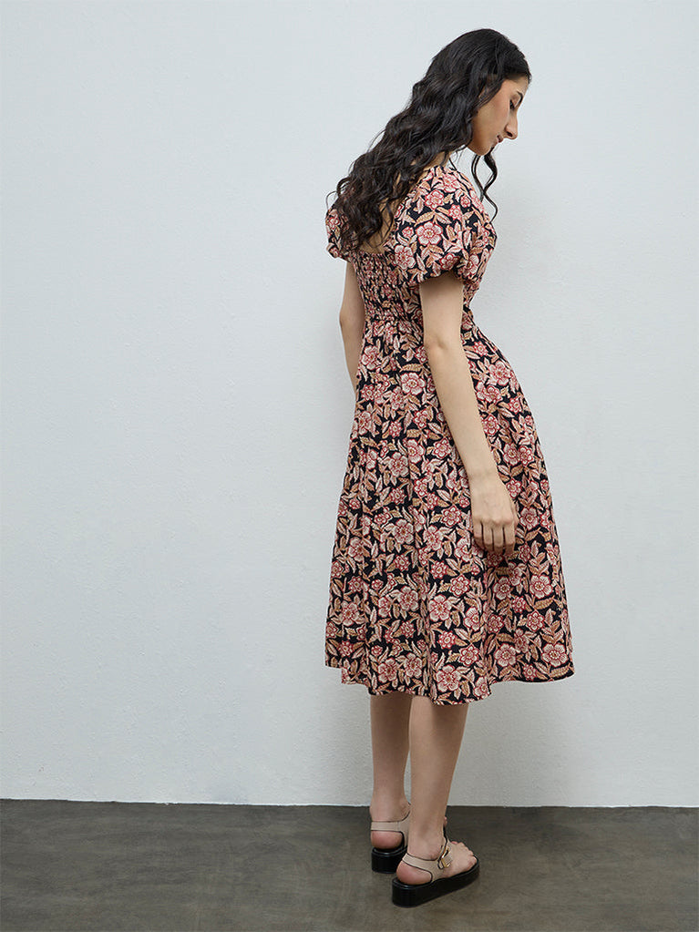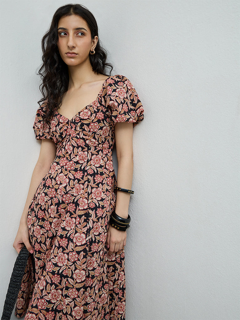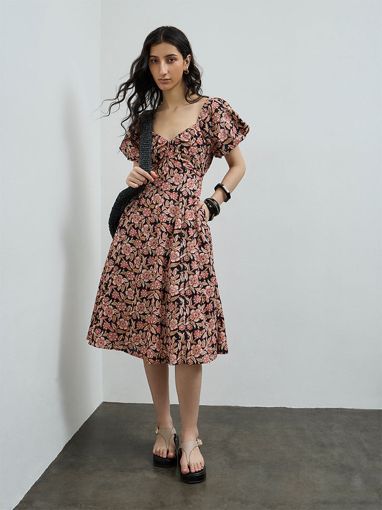 Romanticise everyday dressing with this black dress from Bombay Paisley, adorned with delicate floral motifs throughout. Shaped in an A-line silhouette and crafted from a cotton-rich fabric, it features a sweetheart neckline and puff sleeves, while the smocked back ensures a flattering, comfortable fit.