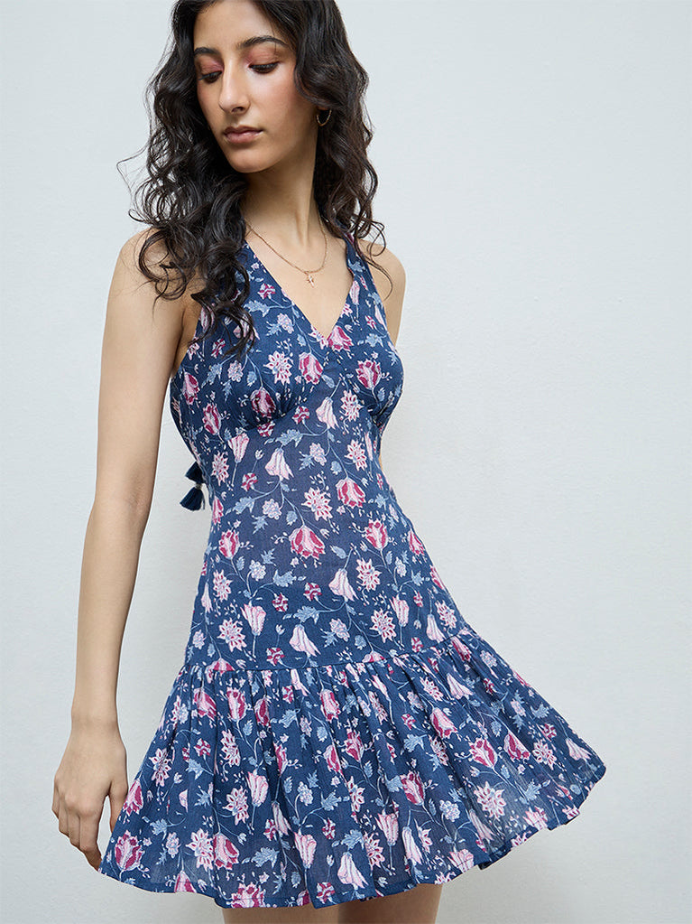 Drift into warm-weather elegance with this blue floral dress from Bombay Paisley, designed to feel light and effortless. Made from a cotton-rich fabric, it is styled with a plunging halter neckline that ties at the back, creating a breezy silhouette perfect for sunlit days.