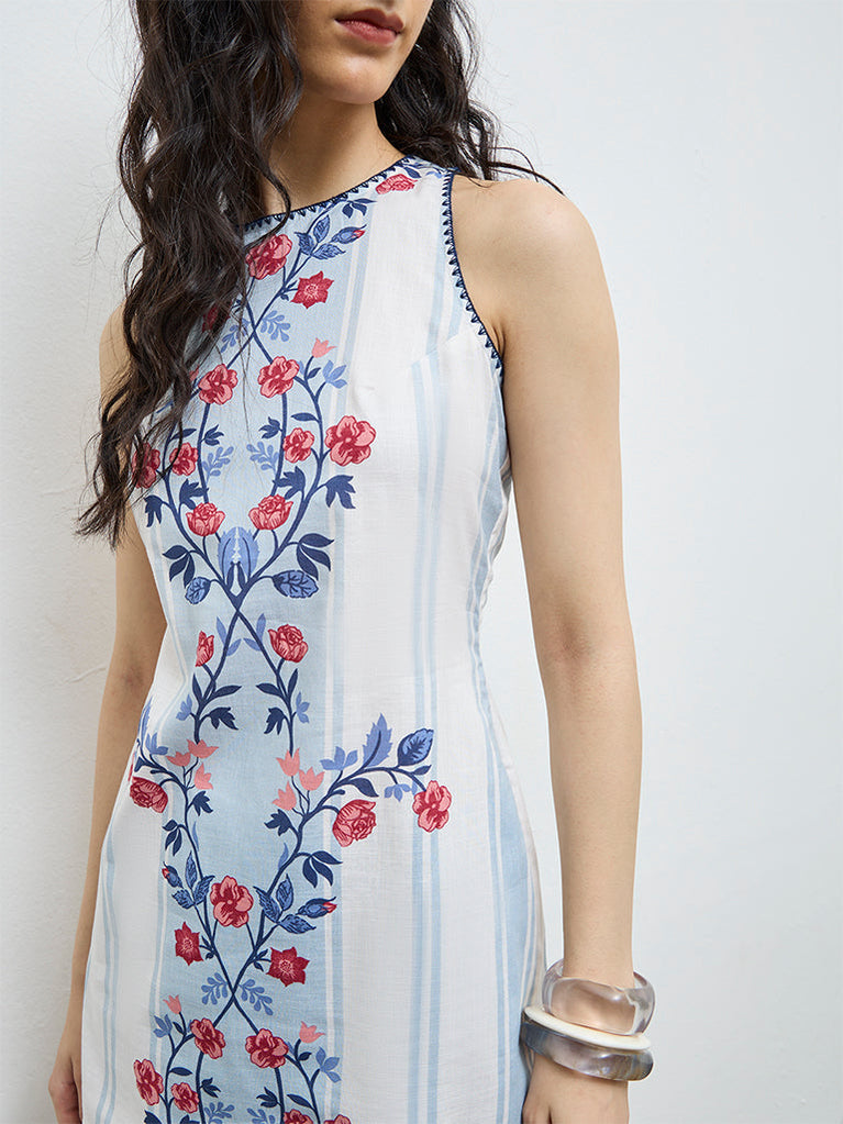 Keep summer styling effortless in this white shift dress from Bombay Paisley, adorned with delicate floral motifs throughout. Made from pure cotton, it features a clean round neckline and a sleeveless cut that feels light and unfussy. A striped base adds a timeless touch, making it ideal for warm, laid-back days.