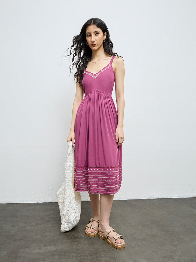 Slip into graceful comfort with this dusty rose dress from Bombay Paisley, shaped in a flattering empire-line silhouette. Made from a breathable fabric, it is accented with delicate embroidery along the hem. The V-neckline, adjustable shoulder straps, and a functional side pocket lend both ease and everyday practicality.