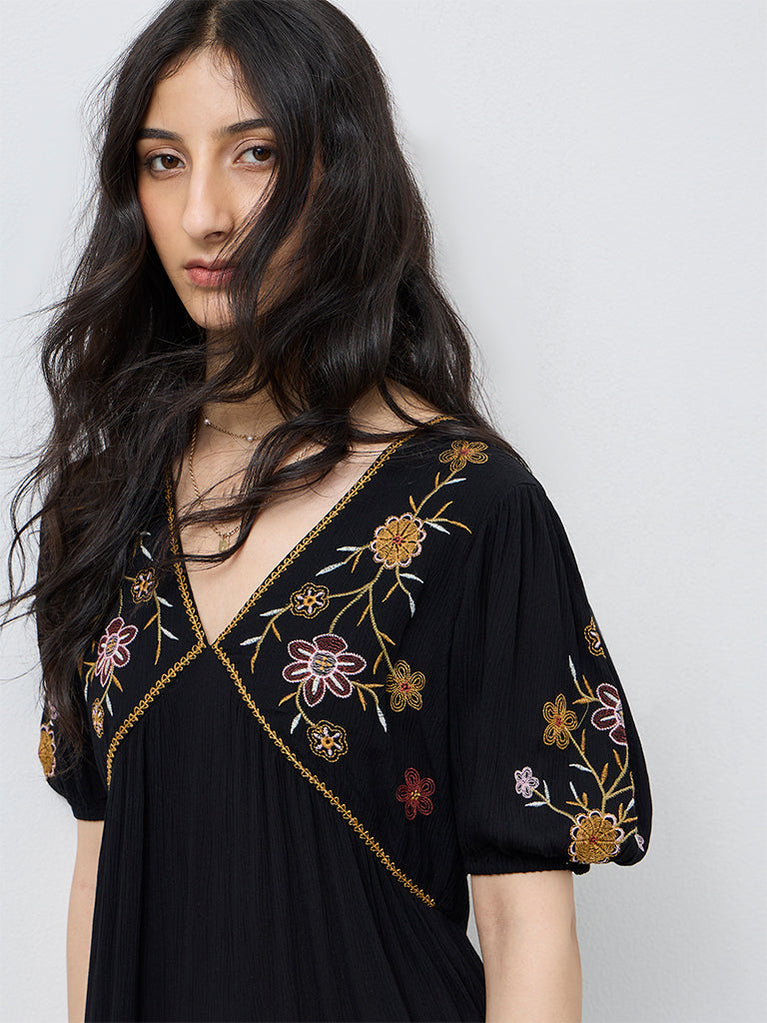 Balanced with detail and flow, Bombay Paisley brings a refined approach to everyday dressing with this black dress. Constructed from cotton-rich fabric in an A-line silhouette, it falls with ease and movement. Floral embroidery placed along the bodice adds definition, complemented by a V-neck and short sleeves that structure the upper frame. This style is suited to relaxed, everyday summer wear with a dressed-up edge.